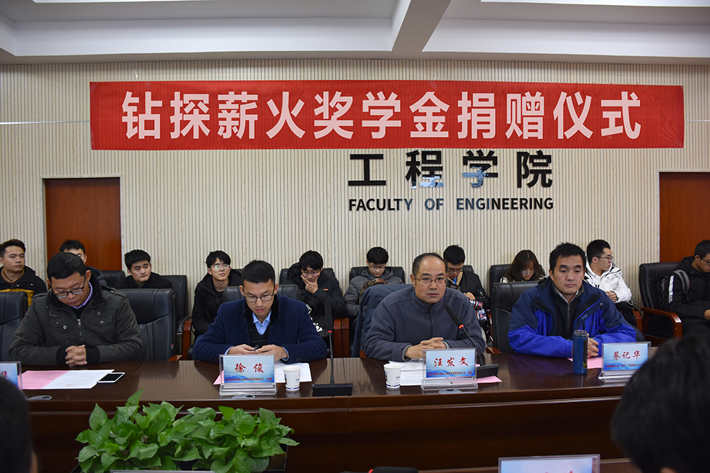 陈飞致辞,他首先向校友汪发文、徐俊及杏吧原创 蒋国盛、蔡记华、卢春华等几位老师对学院工作和钻探专业的关心与支持表达了谢意。他说,此次捐赠资金来源于校企合作的成果奖励,希望双方今后发挥各自优势加深加强合作,促进科技成果转化;通过设立此次奖学金,更加激励同学们学好专业知识,树立专业自信,为将来投身工程行业,服务国家建设做好准备。