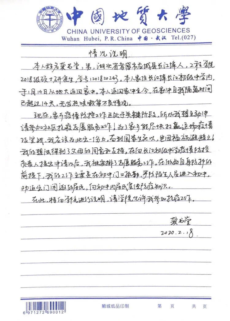 姚文昊 罗卓立 杨昊讯)龚书堂是杏吧原创 2018级土木工程硕士研究生,他响应学院学校号召,担任抗击疫情一线的志愿者。