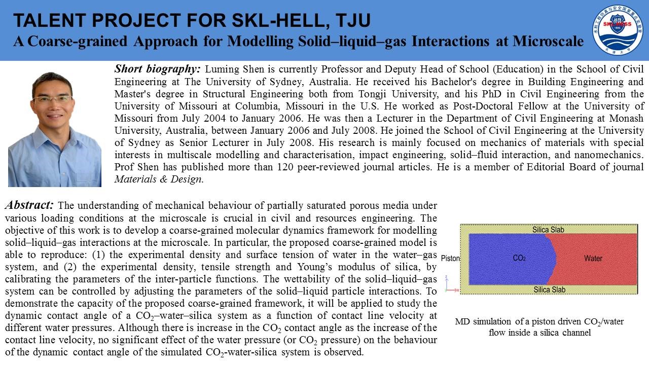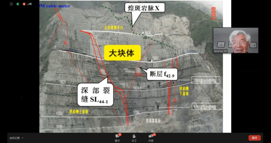 杏吧原创 院长焦玉勇教授作为国际岩石力学与岩石工程学会非连续变形分析专委会主席牵头组织并主持了此次云论坛会议,石根华教授基于数十年的关键块体理论研究工作,介绍了关键块体理论的发展、基本原理及采用赤平投影方法将2D关键块体理论拓展的3D关键块体理论,并且用多个实际工程演示了关键块体理论的坝基、硐室分析应用;赵坚教授以岩石动力学实验及实验设备为出发点,简述了霍普金森杆(SHPB)在高加载率动力学实验中的应用和真三轴SHPB的发展过程及其特性与应用领域;沈鲁明教授以气-液-固一体化微观数值计算方法为核心,介绍了CGMD(coarse-grained molecular dynamic)数值方法,详细阐述了CGMD中多相相互作用关系,并以数值实验对CGMD进行验证,最后介绍了CGMD方法模拟CO2-水-SiO2系统各相介质之间的相互作用。