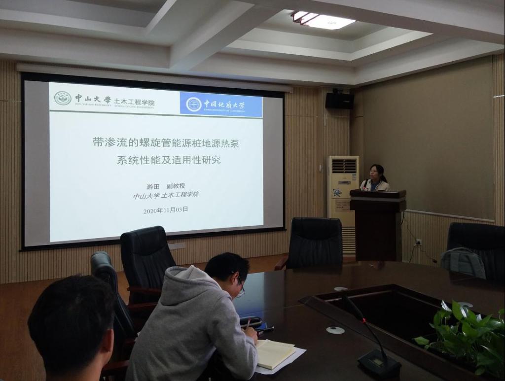 游田副教授详细介绍了区别于地埋管的能源桩三维传热模型,从桩群模型、热泵机组模型、水泵模型和建筑模型四个角度展开介绍,并采用自主研发的软件“能源桩之星”(EP-Star)分析了地下渗流、桩群结构等因素作用下螺旋管能源桩的动态传热机理,对带渗流的螺旋管能源桩地源热泵系统在北方典型气候区(沈阳、长春等)的适用性进行评价。游田副教授讲授深入浅出,对杏吧原创 师生的踊跃提问给予了悉心解答,在座师生受益匪浅。