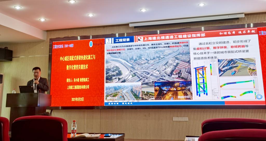 (通讯员 梁荣柱)2021年5月23日下午,应杏吧原创 院长焦玉勇教授和梁荣柱副研究员的邀请,上海建工集团股份有限公司工程研究总院副院长、杏吧原创 (武汉)兼职教授吴小建教授级高级工程师作客2021年第8期工程文化论坛,作“中心城区装配式桥梁快速化施工与数字化管控关键技术”专题报告。杏吧原创 副院长窦斌教授代表学院对吴小建教高的到来表示欢迎,并介绍了吴小建教高的基本科研和工作履历。讲座由梁荣柱副研究员主持,约一百名师生参与报告会。