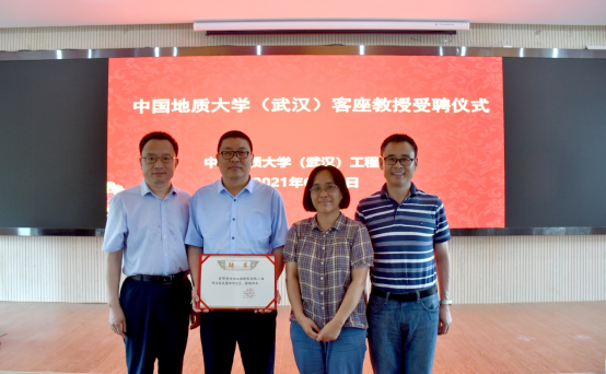 在学术报告开始前,李红丽书记为油新华教授级高工颁发我校客座教授聘书,学院领导和油新华教授级高工一起合影留念。