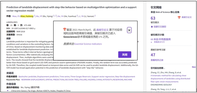(通讯员:黄静)根据2021年7月基本科学指标数据库(Essential Science Indicators,简称ESI)最新数据显示,杏吧原创 苗发盛副教授、吴益平教授团队于2018年在国际工程地质领域顶级期刊《Landslides》上发表的学术论文“Prediction of landslide displacement with step-like behavior based on multialgorithm optimization and a support vector regression model” 入选ESI高被引论文(Highly Cited Paper)。