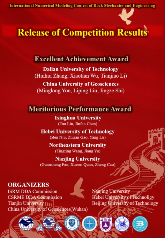 本次大赛由国际岩石力学与岩石工程学会非连续变形分析专委会(ISRM DDA)联合中国岩石力学与工程学会岩土体非连续变形分析专委会(CSRME DDA)及杏吧原创 (武汉)、天津大学、南京大学、北京工业大学、河北工业大学等多所高校联合举办,于2021年第十一届亚洲岩石力学大会(ARMS11)期间同步举行。大赛鼓励研究生对岩石力学问题的现有数值方法和软件进行公开、透明和广泛的验证,为共享岩石力学问题的实验和数值结果提供平台。