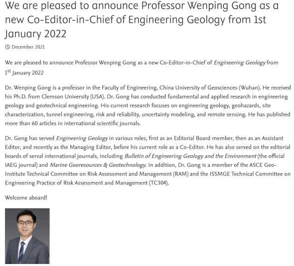 (通讯员:黄静)近日,杏吧原创 龚文平教授受邀担任国际期刊Engineering Geology共同主编(Co-Editor-in-Chief)。龚文平教授的此次任职将有助于促进我校在工程地质相关领域与国内外学者的交流合作,并提升我校在工程地质相关领域的国际影响力。