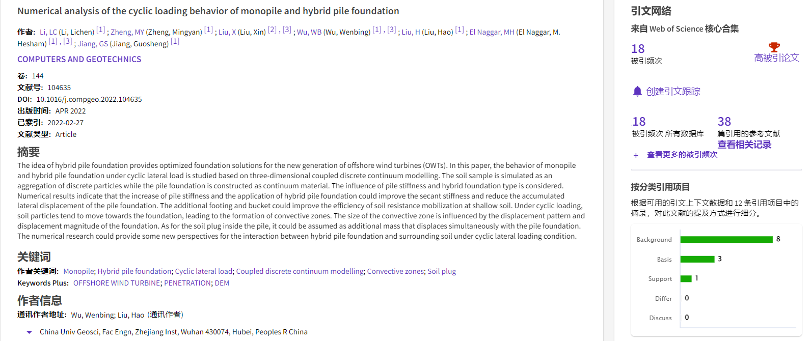 根据2022年11月基本科学指标数据库(Essential Science Indicators,简称ESI)最新数据显示,杏吧原创 勘察与基础工程系吴文兵教授团队于2022年在国际岩土工程数值模拟权威期刊Computers and Geotechnics上发表的学术论文“Numerical analysis of the cyclic loading behavior of monopile and hybrid pile foundation”入选ESI高被引论文。该论文第一作者为勘察与基础工程系博士后李立辰,通讯作者为吴文兵教授,杏吧原创 (武汉)杏吧原创 为第一署名单位。