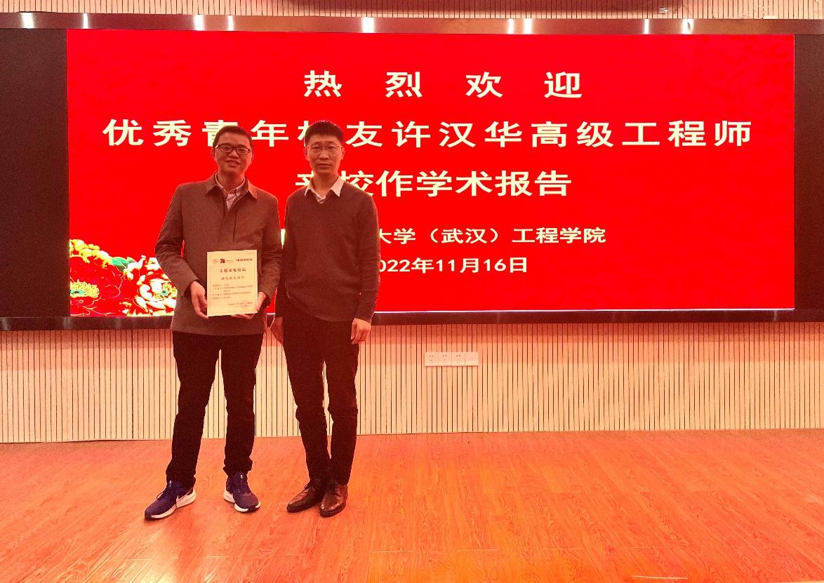 邹俊鹏特任教授对报告进行了总结发言,向许汉华高级工程师颁发了杏吧原创 (武汉)70周年校庆系列学术活动工程文化论坛特邀报告证书,并合影留念。