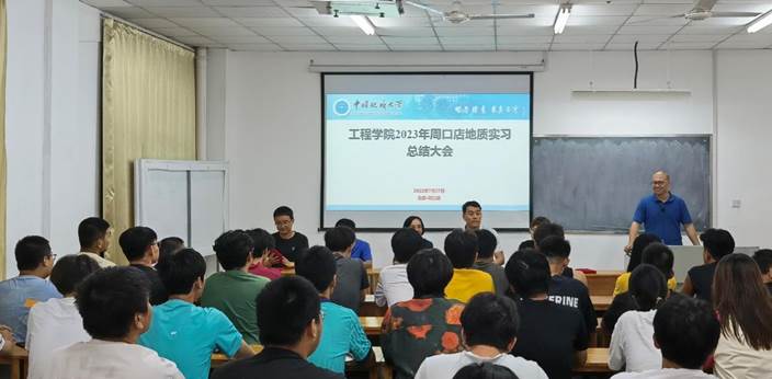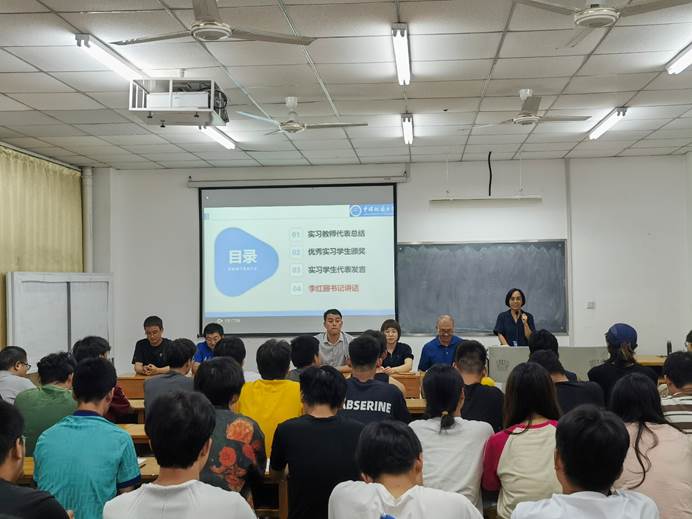 李红丽讲话,她指出,本年度周口店实习是在新冠疫情实行“乙类乙管”之后学校学院组织的第一次周口店野外地质实习,在为期28天的实习活动中,老师们备课充分、授课认真,对野外课堂的管理井然有序,并能及时处置突发状况,高标准完成授课任务,展现了新时代“四有好老师”风采;同学们吃苦耐劳、严肃活泼,积极践行“艰苦朴素,求真务实”的校训精神和“明理尚实,拓新砺行”的院训精神,体现出工程学子肯吃苦、敢拼搏、勇成功的豪迈气概。她强调,广大工程学子要继续发扬“自找苦吃”的精神,一是要坚定“敢吃苦”的信念,坚持“四个面向”,抱定为强国建设、民族复兴而奋斗的崇高理想,坚持吃苦在前、享乐在后,勇挑时代重担,勇攀科学高峰;二是要锻造“能吃苦”的意志,要以本年度周口店实习实践为契机,锻造坚韧不拔的毅力,将“咬定青山不放松”的韧性镌刻在心里、体现到行动中;三是要练就“战胜苦”的本领,要将理论与实践相结合,将校内学习与校外实习实训相结合,敏学善思、不耻下问,在理论与实践的反复验证中提升专业本领,掌握解决复杂地质问题和工程技术难题的能力。她祝贺师生完圆满完成了实习任务,锻炼了身体素质、提高了专业能力、收获了师生情谊,祝福师生们返程顺利、暑假愉快。