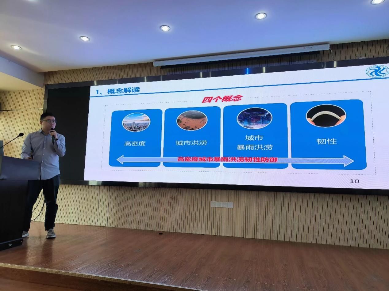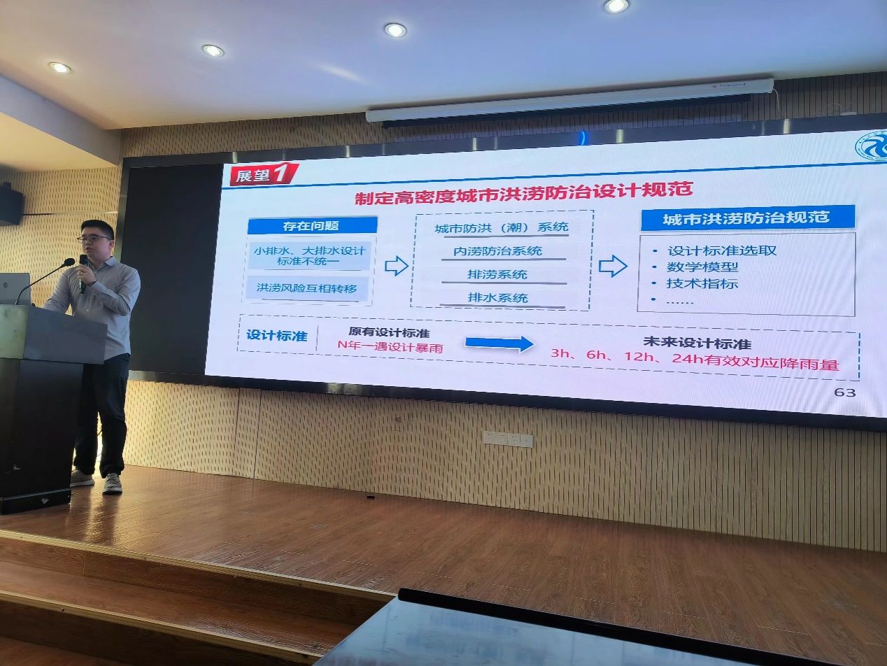 魏乾坤主任做了题为“高密度城市暴雨洪涝韧性防御及岩土工程思考” 的学术报告。他首先介绍了高密度城市暴雨洪涝灾害特征及成因,即我国高密度城市暴雨洪涝灾害损失大、突发性强、致灾快的基本特征。其次从暴雨产流、防御体系、城市基础设施三方面分析高密度城市暴雨洪涝灾害成因。魏乾坤主任总结了广州、深圳规划编制经验,结合 “城市海绵-市政小排水-水利大排水”耦合水文水动力模型,从目标、内涵、技术三大层次提出高密度城市暴雨洪涝治理理论。最后从工程、非工程体系两大角度提出高密度城市暴雨洪涝韧性防治对策。本次报告也指出从城市水利工程、岩土工程、工程地质、水文地质等多角度交叉融合探讨城市内涝问题的解决方案是城市防灾减灾的重要课题。
