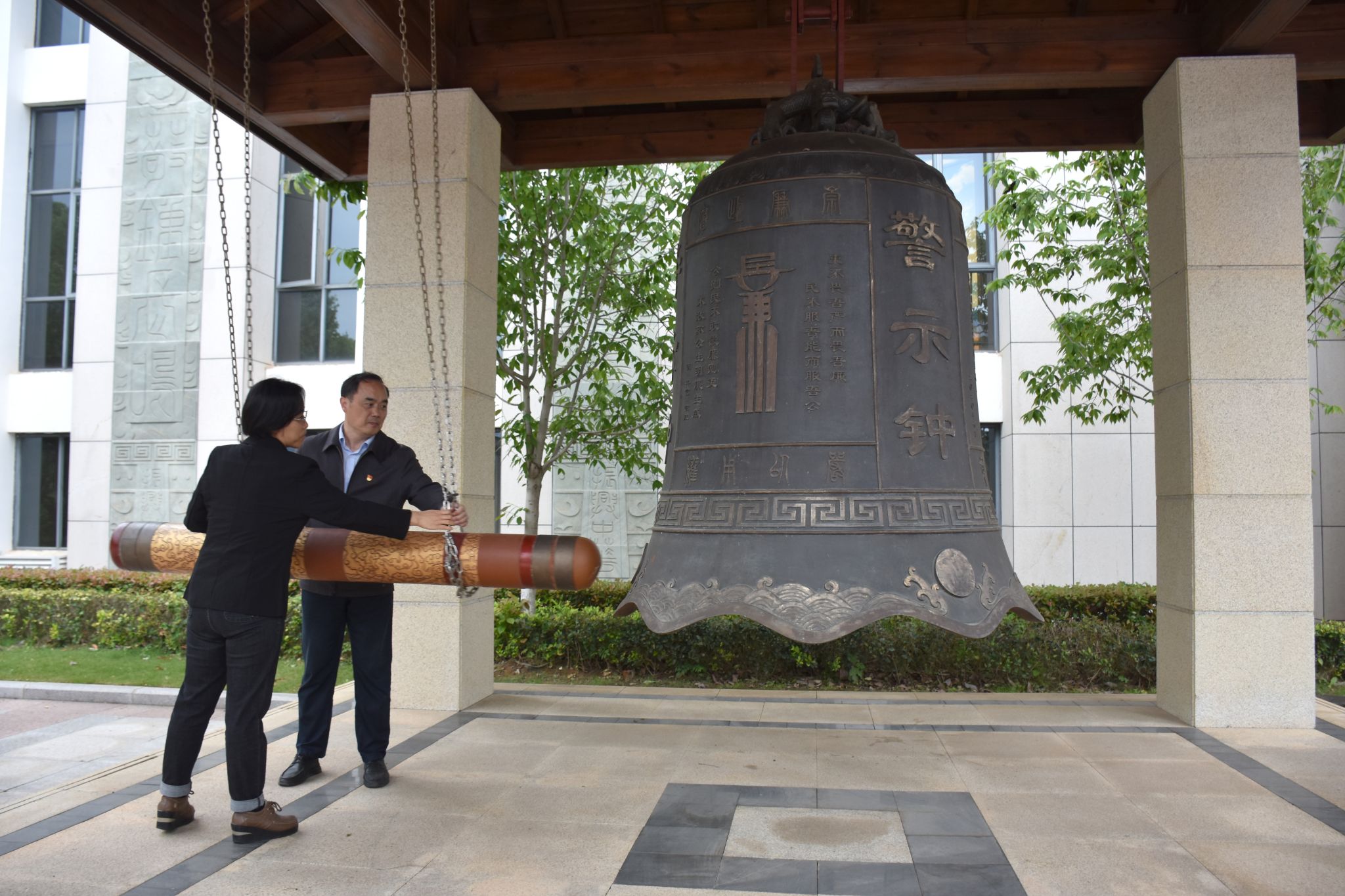 参观完展馆后,全体师生党员来到警示钟前,举行庄严的敲响警示钟仪式。由校园规划与基建处处长李鹏翔与学院党委书记李红丽共同敲响警示钟,警示党员干部要学纪、知纪、明纪、守纪,营造风清气正良好政治生态。