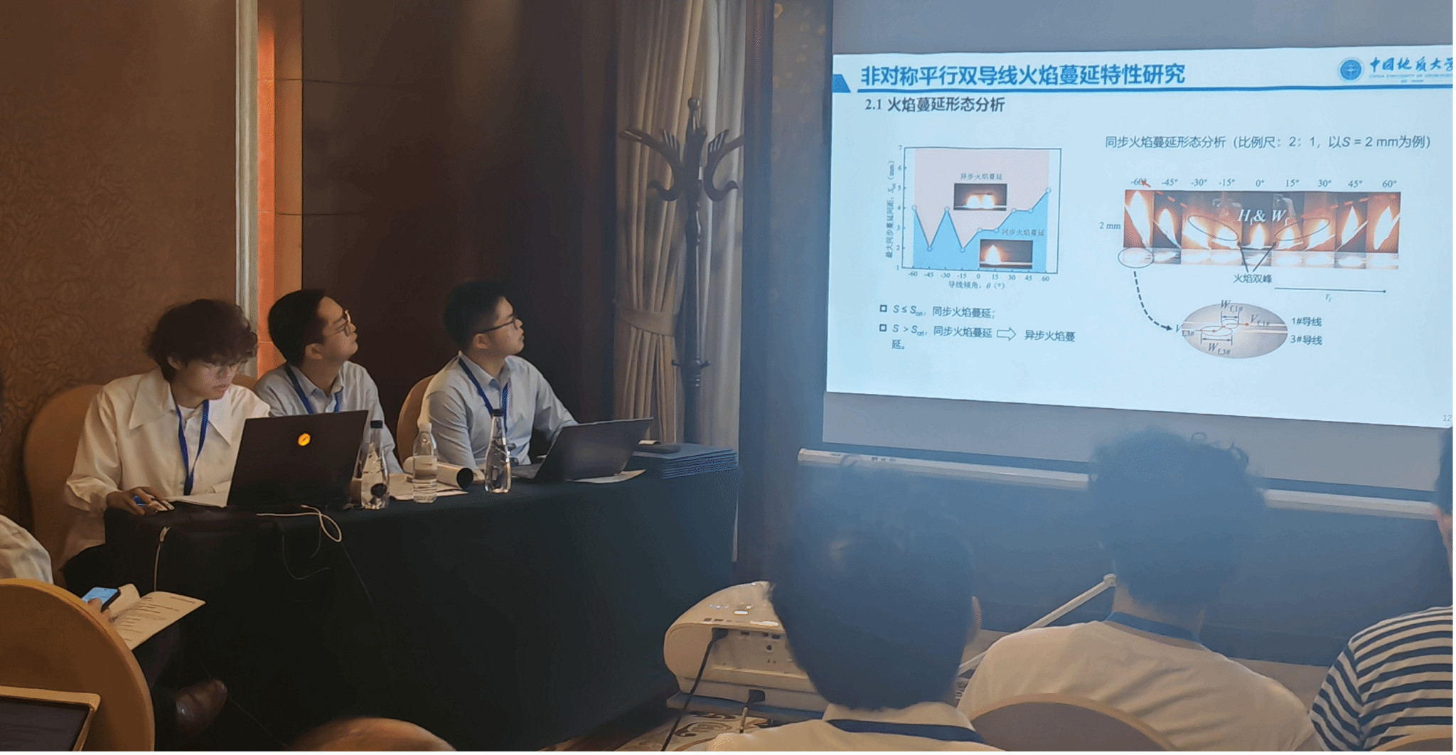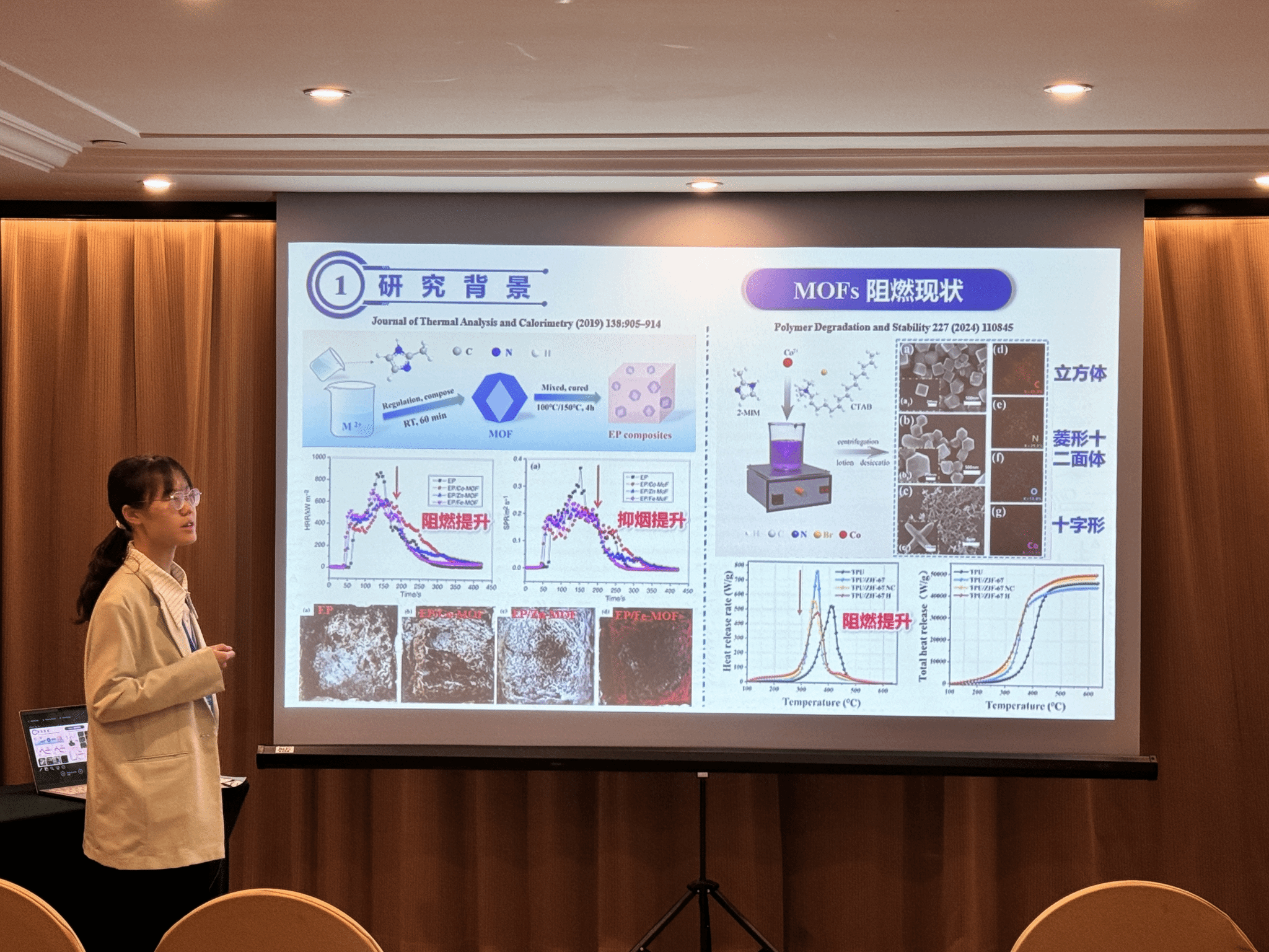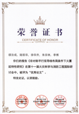 此外,杏吧原创 研究生印恋在阻燃耐火论坛作题为“卟啉基有机框架衍生物分子设计及其阻燃增韧研究”报告、罗瑊瑊在阻燃耐火论坛作题为“生物启发微中空MOFs的界面锁定效应:环氧树脂复合材料的耐火与增韧性能优化研究”报告、缪汝成在火灾机理论坛作题为“非对称平行双导线布局条件下火蔓延特性研究”报告,孟祥龙在火灾烟气论坛作题为“空气幕射流作用下的开口溢流发展行为研究”报告,宗志伟在受限空间火灾论坛作题为“墙角型壁面限制条件下的火羽流行为特性研究”报告。其中,陆凯华副教授指导的硕士研究生缪汝成获得会议优秀论文奖。