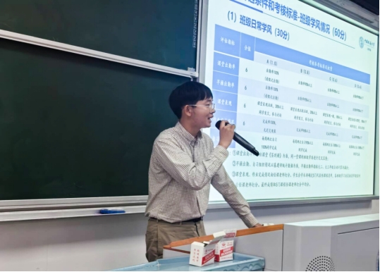 2024级辅导员彭友元介绍《杏吧原创 (武汉)杏吧原创 “优良学风示范班”创建评选办法》。他从“优良学风示范班”总体要求、创建流程、考核指标、奖惩办法等四个方面进行介绍,重点解读了班级政治理论学习、遵纪守法与文明修养、集体观念、班级制度建设、班级干部表现等5项班级综合表现指标,课堂出勤、早操出勤、课堂表现、作业完成情况、自习组织情况等5项班级日常学风指标,平均学分绩点、优秀率、及格率和英语四级通过率等4项班级课程成绩指标,以及学生参加科技创新活动等附加分项目指标。他要求同学们仔细阅读创建办法文件,对照量化评估考核指标,积极开展富有班级特色的学风建设活动。